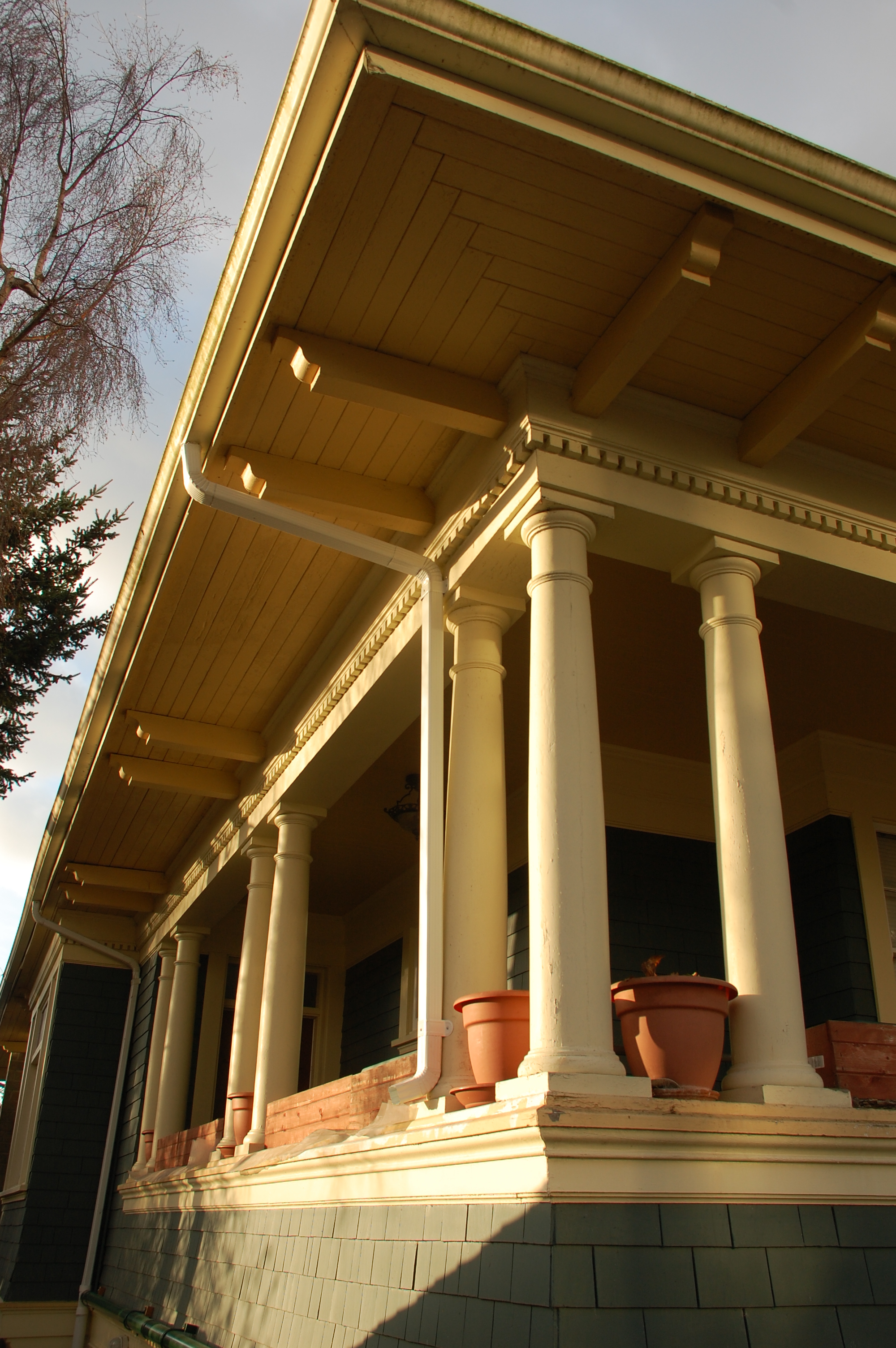 It's hard to know just how many of these often-fetching homes were actually constructed during the type's heyday, as there is no comprehensive list that I'm aware of and heritage-listing by municipalities is erratic at best. The beautiful example above, with its ground floor classical detailing mostly intact, apparently enjoys no heritage protection (it is far from alone in this regard). The dormer above the recessed entryway has been modified to incorporate additional windows to admit more light, but unfortunately the new windows are not up to the standard of the original millwork. Colonial bungalows benefited hugely from the availability of cheap, high-quality, old growth timber that was milled or split from B.C.'s abundant fir and cedar forests, a factor that helped to keep costs down for consumers. The other factor moderating cost was the sudden availability of cheap lots that were opened up by electric streetcar services, a process that commenced early in 1890. The house shown here is large enough to now be suited, as the separate power meters visible in the photo above suggest.
